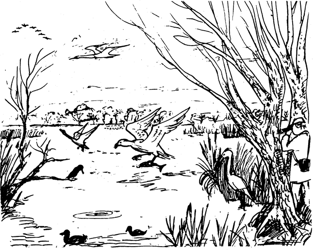 The habitats in the area of Alresford Pond are very varied. The Pond itself is really a lake and originally this was more than twice its present size. The area that used to be water-filled is now a marsh with extensive reed-beds. The silting-up is continuing in the present lake, so that it is no more than a few inches deep over a vast area, and mud is exposed at same seasons. The part of the lake nearest the road has not so far silted up and is very deep. There is an alder wood and areas of sallow and willow scrub around the pond. In each of these habitats there are different birds.