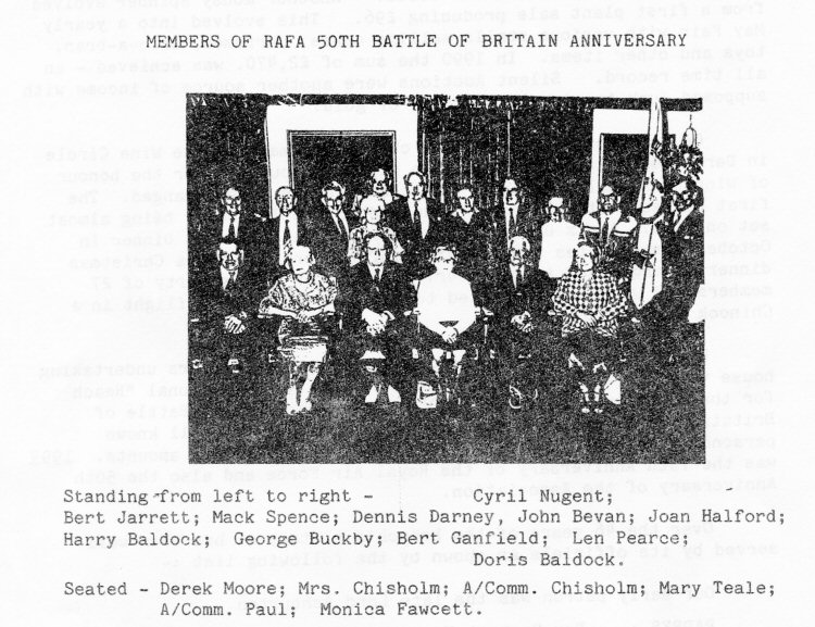 Over the years there have been many events and occasions. One of the first was a Battle of Britain dance in the Legion Hall in September 1949. It was so crowded people were sitting on the window sills. A raffle produced the princely sum of £21 - an impressive figure at the time. The first Annual Dinner was held in the Cricketers. Twenty five members tucked in to Steak and Kidney pudding, cooked by mine hostess, Mrs. Boniface. In the late fifties members went gliding at Lasham. The cost was £3.per person and to the best of our knowledge they all returned safely. :Dances and social evenings were also held in the Old Sun Inn by permission of landlord, Cameron Black. The Sun Inn later became the! home of cricket commentator, John Arlott. A memorable fund raising event in 1981 saw a very active Air Commodore Christopher Paul, already in his 70's, together with Christopher Brill, partaking in a sponsored cycle run from Alresford to Dunsford. A considerable sum of money resulted from their efforts.