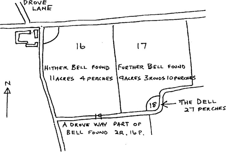 The tithe map of New Alresford of 1842¹ shows areas numbered 16, 17, 18 and 19 named in the administration respectively as 'Hither Bell Found Field', 'Further Bell Found Field', 'A Dell' and a drove way, part of Bell Found.